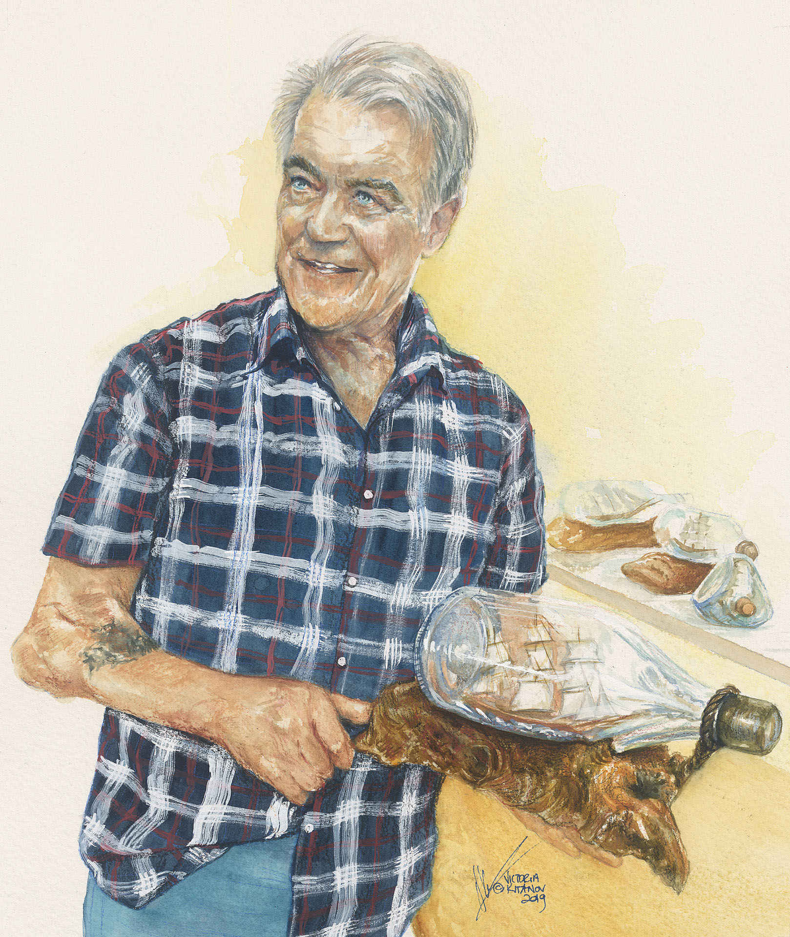 A master of the art of the ship-in-a-bottle, Jock’s unique craft began as a slow rehabilitation following an horrendous motorcycle accident and is all the more amazing considering the damage to his arms and hands.